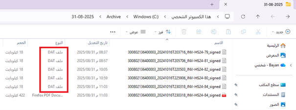 داخل كل مجلد يوجد xmlكل فاتورة من الفواتير التي تم تسجيلها في هيئة الضريبة والزكاة، والذي يجب التحقق من عدده، علماً ملفات xmlهي الملفات التي لاحقتها DAT أما ملفات الpdf هي الملفات التي يتم توليدها في حال الحصول على الفاتورة من خلال زر .PDFA3
