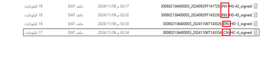 ملاحظة 1: ملف INV هو ملف الفاتورة أما ملف CN هو ملف الإشعار الدائن وملف DN هو ملف الإشعار المدين.