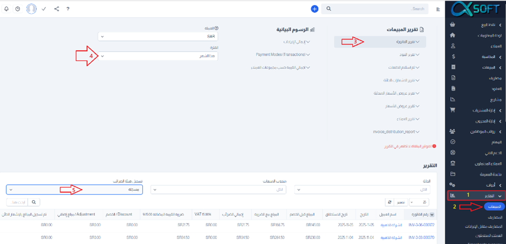 من التقارير << المبيعات << تقرير الفاتورة << تسجيل هيئة الضرائب "مسجلة" << الفترة اختر الفترة على أن تكون نفس اليوم مثلاً من تاريخ: 1\11\2025 إلى تاريخ 1\11\2025