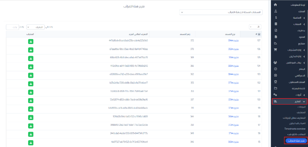 التقارير << تقرير هيئة الضرائب، في هذا التقرير تظهر الفواتير المرسلة إلى هيئة الضرائب وملفات XML لكل فاتورة من الفواتير.
